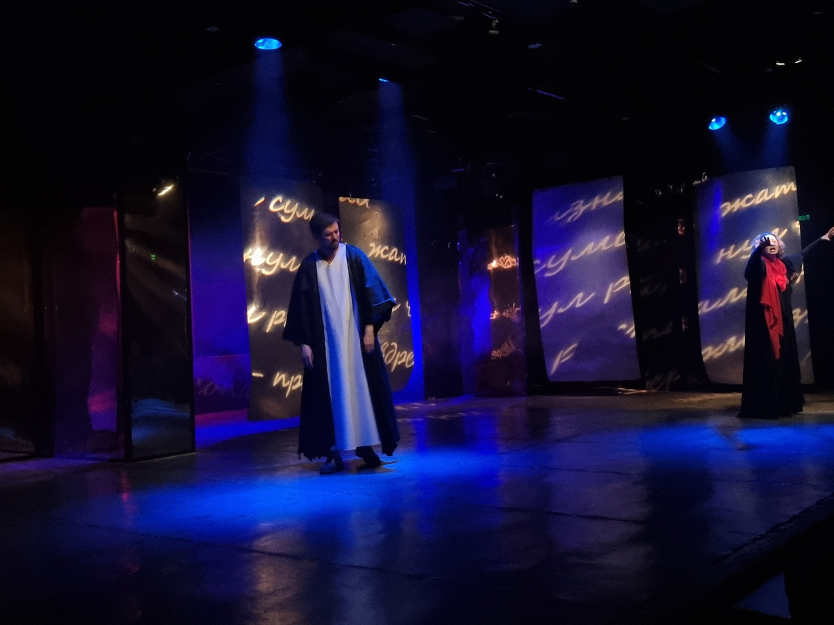 История представлена нам через рассказ от лица Воланда (Антон Багиров) и Мастера (Максим Лакомкин), который написал книгу о Понтии Пилате (Сергей Бородинов). Даже удивительно, как режиссеру удалось вместить все события романа в 3,5 часа спектакля, не упустив деталей и не вычеркнув никаких важных моментов из произведения.