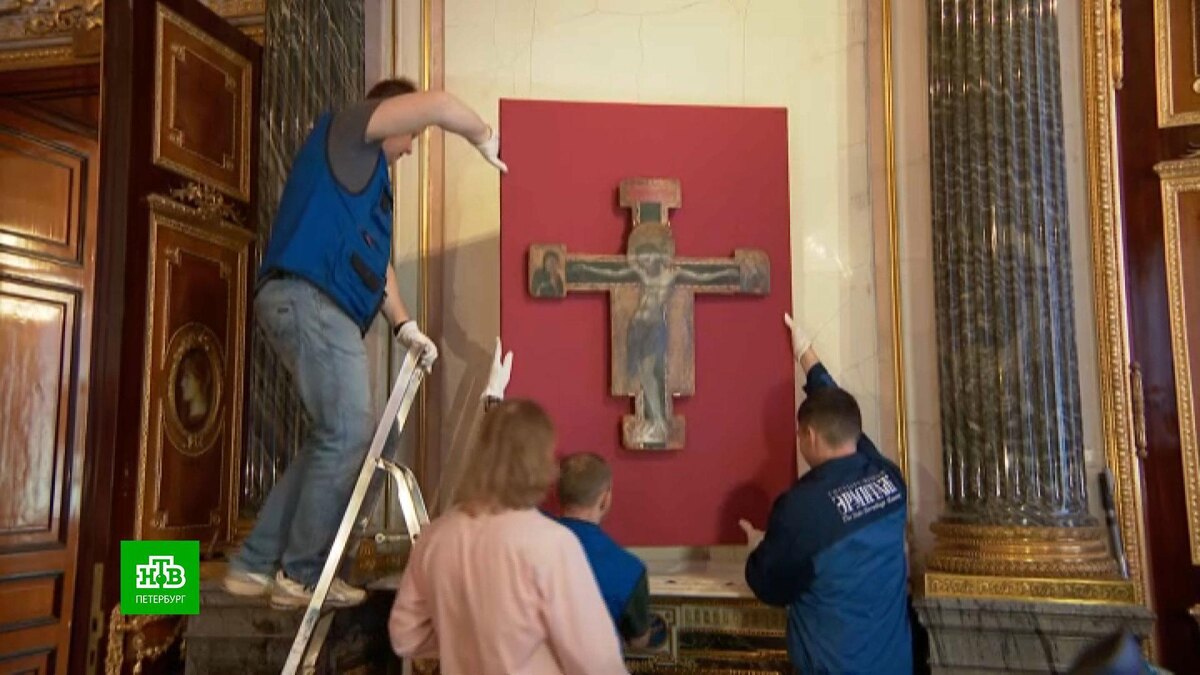 [ Смотреть видео на сайте НТВ ] Сегодня в Эрмитаже на постоянную экспозицию вернулся «Крест с образом распятого Христа». Уникальное произведение пизанского мастера Уголино ди Тедиче сначала находилось на исследовании, а затем работу отправили на трехлетнюю реставрацию. Неспешное передвижение реликвии, чей возраст насчитывает семь с половиной веков, Михаил Пиотровский назвал крестным ходом не только из уважения к самому экспонату. Церемонию приурочили ко Дню реставратора — празднику тех, для кого сохранение мирового культурного наследия сродни религии. Последний раз шедевр пизанского художника Уголино ди Тедиче серьезно реставрировали 90 лет назад. До нас дошли всего четыре работы художника — два креста из Пизы и один из музея искусства в Кливленде. Но только наш крест с изображением распятия имеет автограф его создателя. Зоя Купцова, научный сотрудник отдела западноевропейского изобразительного искусства, хранитель экспоната: «Конечно, это произведение уникально, поскольку оно хранит и