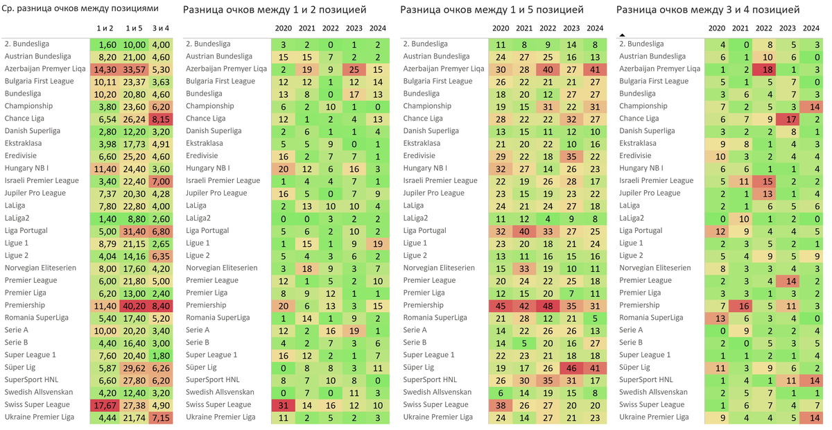 В среднем за 5 сезонов наименьшая разница между 1-м и 2-м местами в «Ла Лиге 2» (1,4 очка), в «Бундеслиге 2» (1,6 очка), в «Датской Суперлиге» (2,8 очка); наибольшая разница в «Швейцарской Суперлиге» (17,7), «Азербайджанской Премьер-лиге» (14,3), в Шотландии (11,4) и Венгрии (11,4). 5-е место ближе всего к чемпиону в тех же лигах, а дальше всего — снова в Шотландии и Азербайджане, а на третьем месте – «Лига Португалии». В борьбе за медали (разница между 3-м и 4-м местами) по плотности лидирует греческая «Суперлига 1» (1,8 очка), на втором месте – «Российская Премьер-лига» (2,4 очка), далее идет «Ла Лига 2» (2,6 очка).