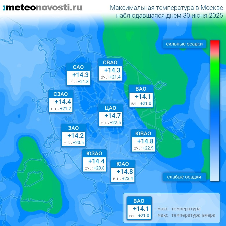 #за12часов #день Прошедший день 30 июня оказался на 7.4°C холоднее вчерашнего. Максимальная температура днём в Москве была на 8.6°C ниже нормы, что значительно холоднее, чем обычно. Самая высокая температура +14.8°C была зафиксирована в 21 час на юго-востоке города, а холоднее всего было на юго-западе: +12.8°C. Разница по максимальной температуре в разных частях столицы составила за день 2°C. Максимальные порывы ветра днём достигали 7 м/с. Атмосферное давление за день понизилось с 728 до 727 мм.рт.ст. На большей части территории города прошли осадки. Больше всего осадков выпало на востоке города – 5.8 мм. Самый теплый день в Москве 30 июня был в 1917 году, когда максимальная температура составила +33.5°C, а холодный в 1882 году: +13°C. Перейти на сайт Прогноз погоды на 14 дней