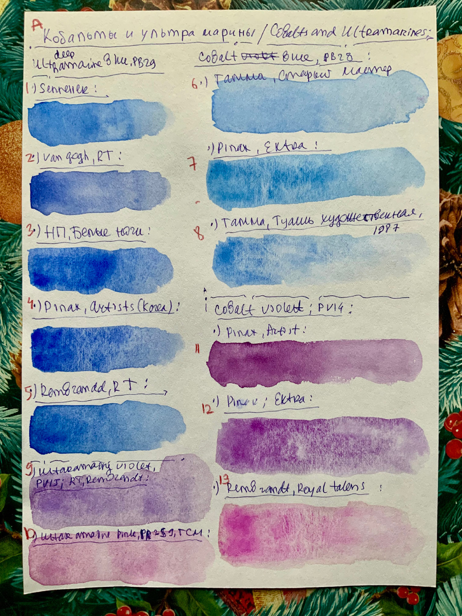 Но вот синие/голубые кобальты отличаются от синих ультрамаринов оттенком — они «зеленее», что видно по моим выкраскам.