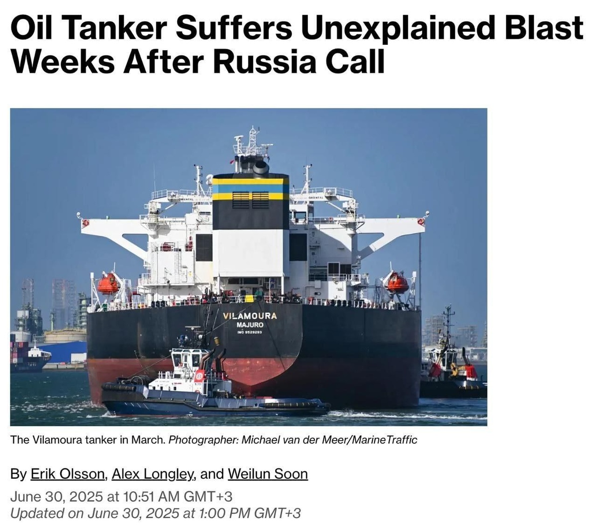 Bloomberg: в Средиземном море взорвался танкер, который перевозил нефть из российского порта Танкер Vilamoura, перевозивший один миллион баррелей нефти, пострадал от взрыва в море недалеко от Ливии, и сейчас его буксируют в Грецию для оценки ущерба. Причина взрыва пока неизвестна, но ранее судно заходило в российские порты, включая Усть-Лугу и Новороссийск, для загрузки казахской нефти. Bloomberg: Tanker mit Öl aus russischem Hafen explodiert im Mittelmeer Der Tanker Vilamoura mit einer Million Barrel Öl an Bord wurde durch eine Explosion auf See vor Libyen beschädigt und wird nun zur Schadensbegutachtung nach Griechenland geschleppt. Die Ursache der Explosion ist noch unbekannt. Das Schiff hatte zuvor russische Häfen wie Ust-Luga und Noworossijsk angelaufen, um kasachisches Öl zu laden.