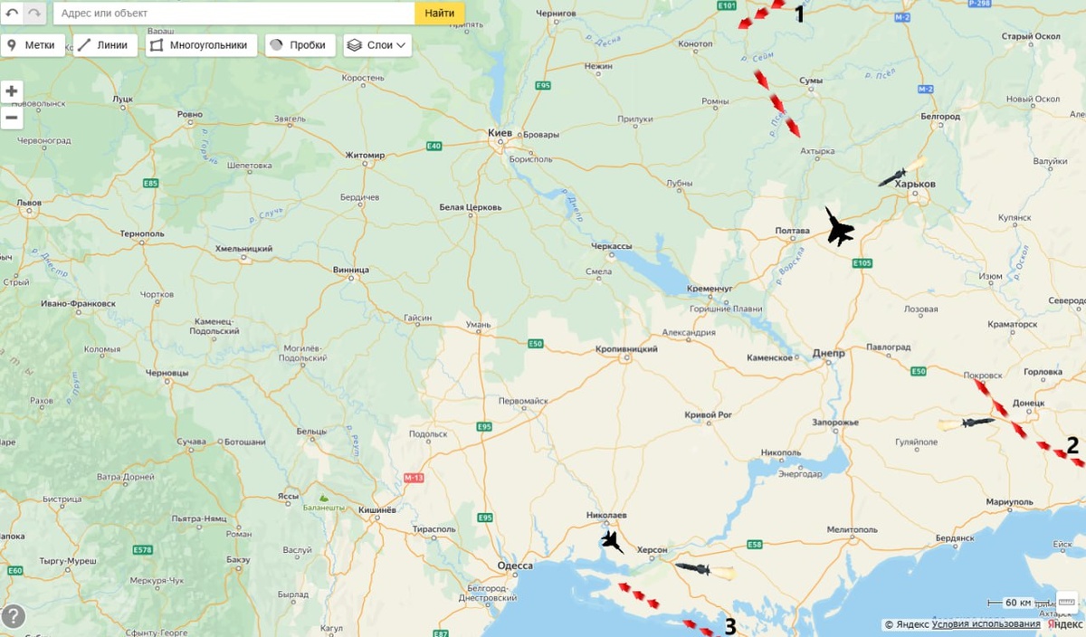 Оперативная обстановка за ближайший час. Группа "Гераней" №1 повернула на Харьков Противник поднял авиацию с аэродромов Днепропетровска и Николаева на перехват наших БпЛА. Российское ПВО пытается сбить эти самолеты. Враг в ответ наносит ракетный удар "Storm Shadow"по Донецку и далее в Ростовскую и Волгоградскую области( видимо на совещании у Зеленского рассматривали этот вариант ответа) схемы и карты