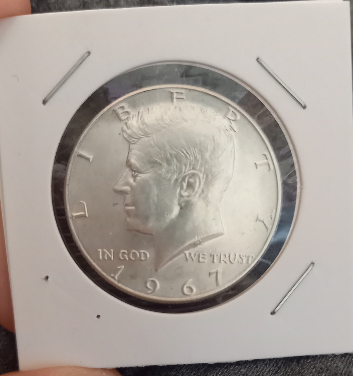 Монета номиналом 50 центов, выпущенная в США в 1967 году, была изготовлена из медно-никелевого сплава, а не из чистого серебра. Это связано с переходом США в середине XX века от изготовления монет из драгоценных металлов к использованию более дешевых сплавов. Тем не менее, в течение короткого периода времени параллельно выпускались две версии полдолларовых монет: одна из серебра, предназначавшаяся преимущественно для коллекционеров, и другая — из меди и никеля, для повседневного обращения. Материал: Эти монеты были изготовлены из 40%-го серебра (остальное медь). Реверс изображал Бенджамина Франклина, одного из отцов-основателей США, дизайнера Джона Рейнхарта (John R. Sinnock). Аверс демонстрирует эмблему Соединенных Штатов — белоголового орлана. Вес около 11,5 г, диаметр — приблизительно 30,6 мм. Хотя серебро в этих монетах присутствует, оно составляет меньшую долю по сравнению с предыдущими годами выпуска (например, до 1964 года использовались монеты с содержанием 90% серебра). Для к