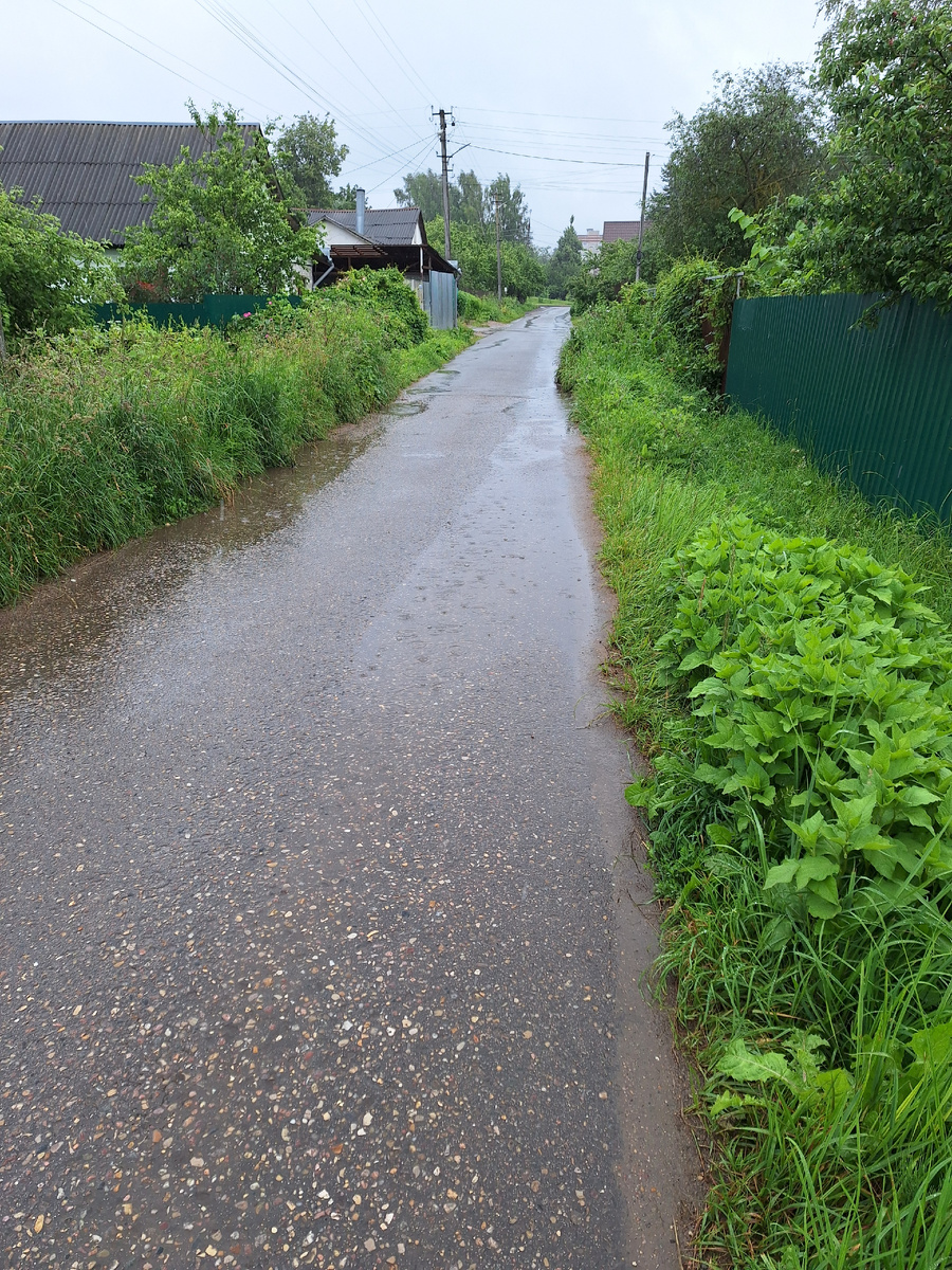 Сезон дождей продолжается. На улице холодно, не больше +15 градусов. На сегодня МЧС прислало штормовое предупреждение: ливни с ветром. Ливнем нас не удивишь, но вот ветер, обещанный в 18 метров в секунду, складывал берёзы пополам. Может и сильнее ветер был, только как эту скорость измерить? Не унесло на улице- хорошо, веткой по голове не прилетело- ещё лучше! Вчера вечером вышли немного пройтись. А так как моя куртка достойно пережила дневной ливень и не промокла совсем, потом дома резко стала тяжёлая, водой напиталась, то я пошла в лёгком свитере и тёплой рубашке. И с первым порывом ветра, минут через пятнадцать после выхода из дома, я стала приятного голубоватого оттенка кожи. Замёрзла прямо сразу...Надо вторую куртку в бездонном шкафу искать и доставать. Скоро до шапки дойдём! Несколько фотографий сделать удалось. Огромные колокольчики цветут. Куст белый стоит, я решила, что снег пошёл, а это лепестки облетают. Розы за забор цепляются, дождём к земле их прижимает. Ещё непри
