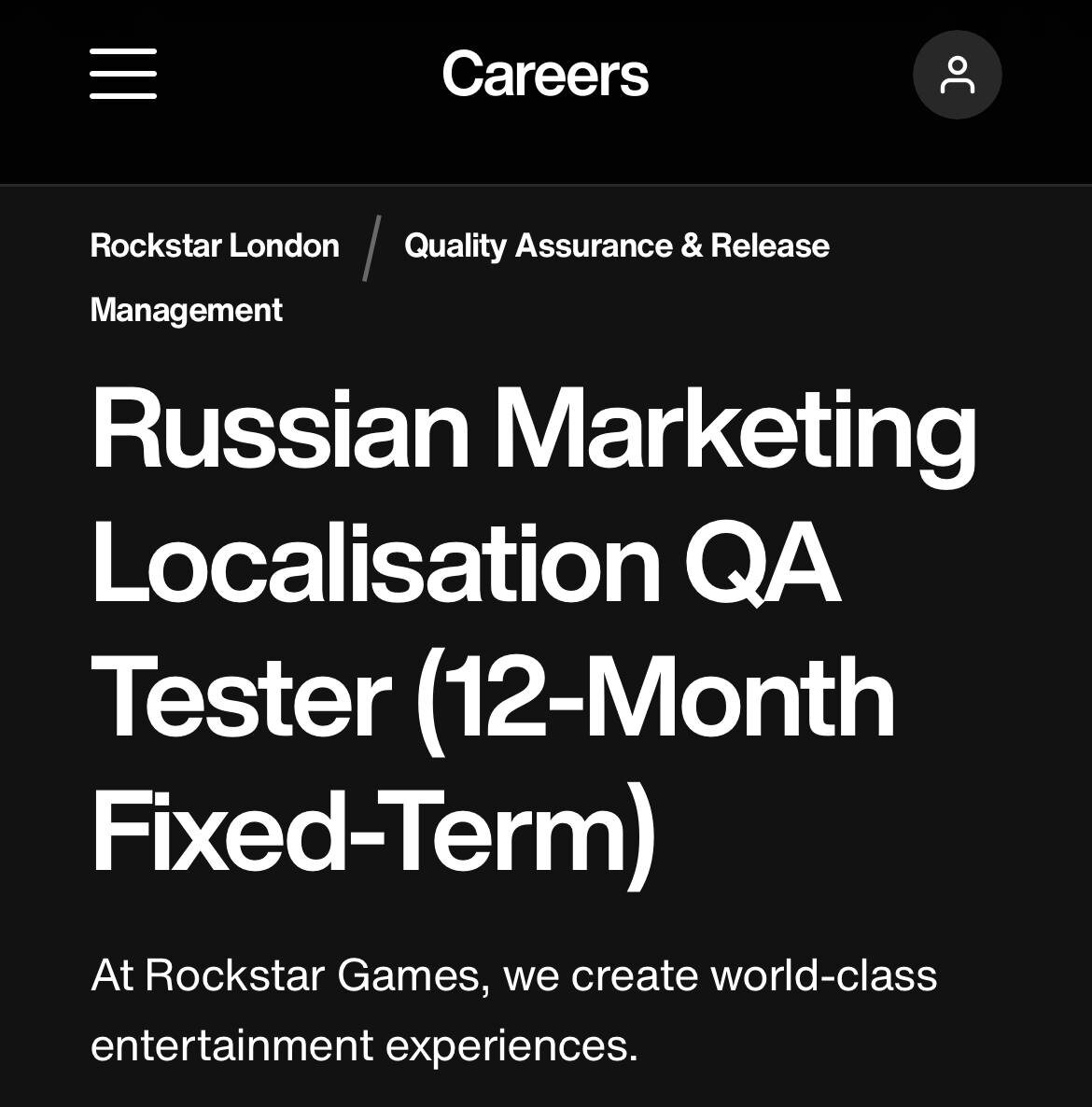 Им требуется специалист на маркетинговую компанию для GTA 6. В течении 12 месяцев вам нужно будет: отслеживать локализацию, помогать редактировать текста, UI/UX дизайнерам и разработчикам с выбором шрифтов.