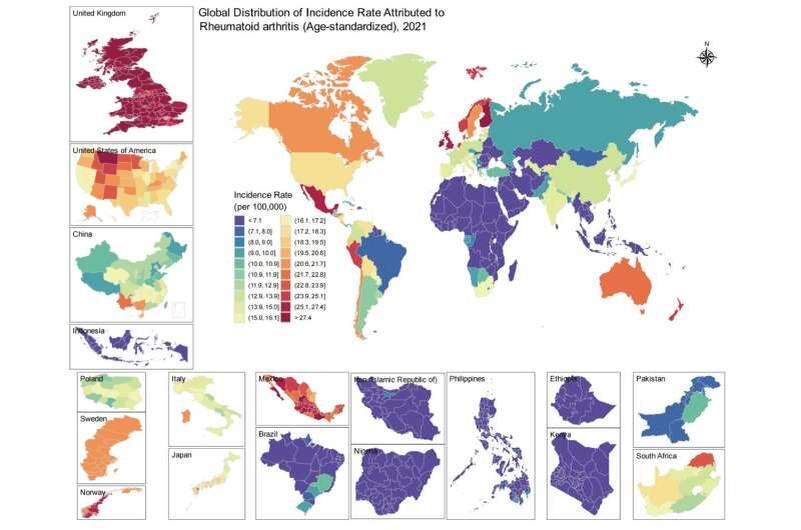 Журнал «Annals of the Rheumatic Diseases» опубликовал результаты масштабного исследования, проведённого с помощью искусственного интеллекта. Исследование показало значительный рост случаев ревматоидного артрита во всём мире с 1980 года и выявило регионы с наибольшей заболеваемостью. Исследование, проведённое Кверан Лин (Queran Lin) из Всемирной организации здравоохранения (WHO), Имперского колледжа Лондона (Imperial College London) и Мемориальной больницы Сунь Ятсена (Sun Yat-Sen Memorial Hospital), использовало передовые методы глубокого обучения и моделирования политики. Учёные проанализировали крупнейшую базу данных о ревматоидном артрите, охватывающую 953 региона мира с 1980 по 2021 год. Исследование включало анализ распространённости, заболеваемости, смертности и лет жизни, скорректированных по нетрудоспособности (DALY). Исследование выявило несколько ключевых фактов: Исследование показало, что экономические факторы не являются единственным определяющим показателем. Например, в Яп