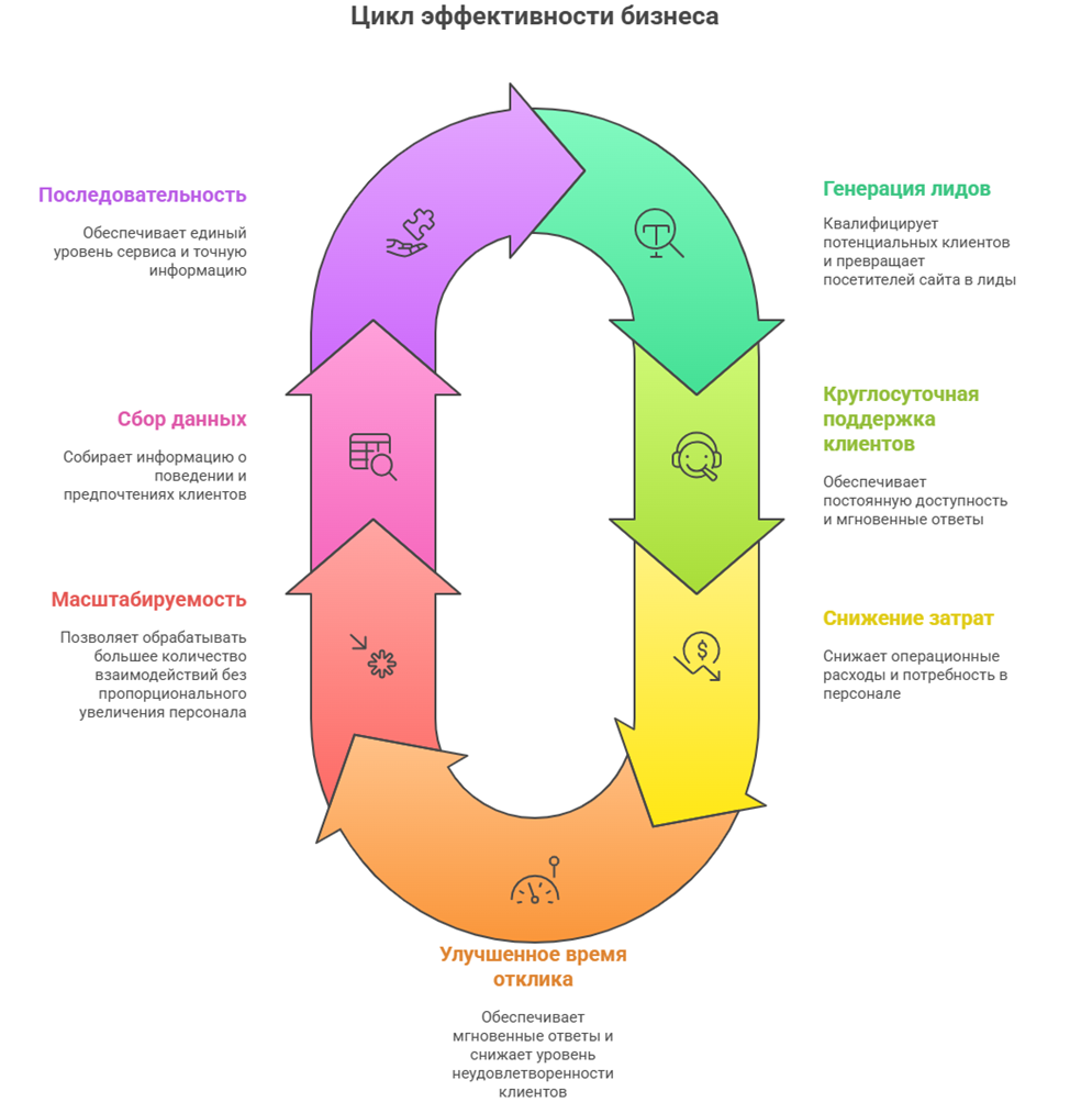 Мгновенные ответы на типовые вопросы, отсутствие очередей и раздражения клиентов. - Масштабируемость