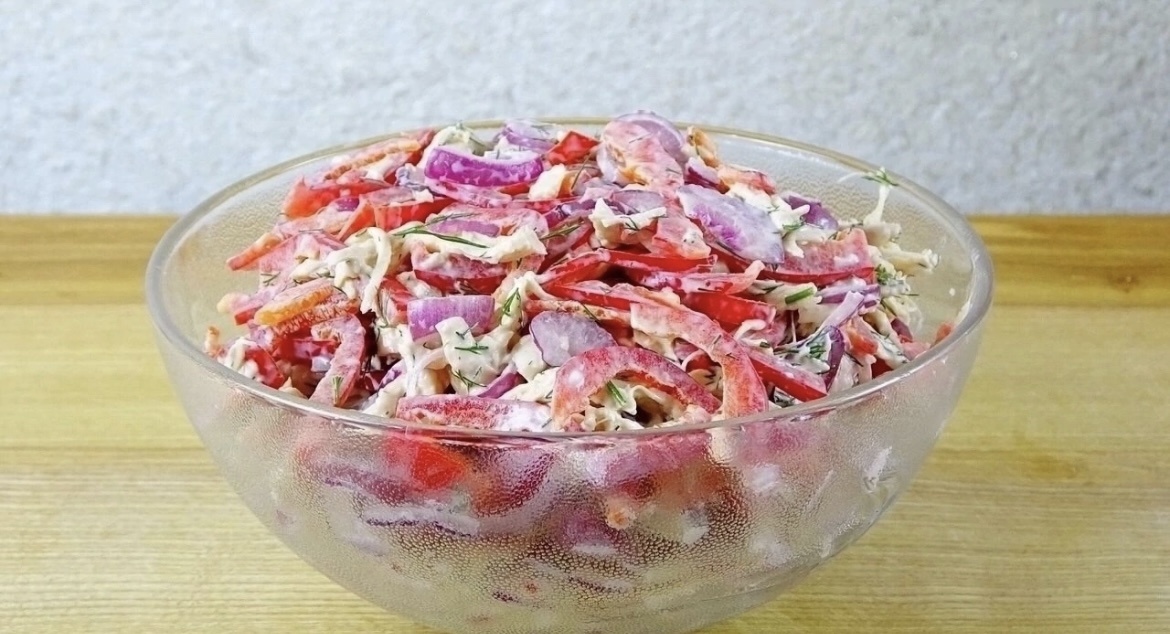 Ингредиенты: ✅ Куриное филе (отварное) – 500 г ✅ Перец сладкий красный – 500 г ✅ Лук красный – 2 шт. ✅ Майонез – 4 ст. л. ✅ Укроп – 4 веточки ✅ Уксус яблочный – 2 ст. л. ✅ Сахар – 1 ч. л. ✅ Соль – 1 ч. л. ✅ Вода – 4 ст. л. Приготовление: 1. Сначала замаринуем лук. Для этого смешаем сахар, соль, яблочный уксус и воду. Красный лук нарезаем полукольцами. Добавляем к нему маринад и перемешиваем. Оставляем мариноваться на 30 минут при комнатной температуре, периодически перемешивая каждые 5-7 минут. 2. Нарезаем красный сладкий перец соломкой и выкладываем в салатник. 3. Куриная грудка уже отварена. Разделяем ее на волокна и добавляем к перцу. 4. Мелко нарезаем укроп. 5. Лук промариновался и стал мягким, как и должно быть. Отжимаем его от маринада и сока, который он пустил, и добавляем к остальным ингредиентам. 6. Заправляем салат майонезом и перемешиваем. При необходимости можно добавить немного Приятного аппетита 😋