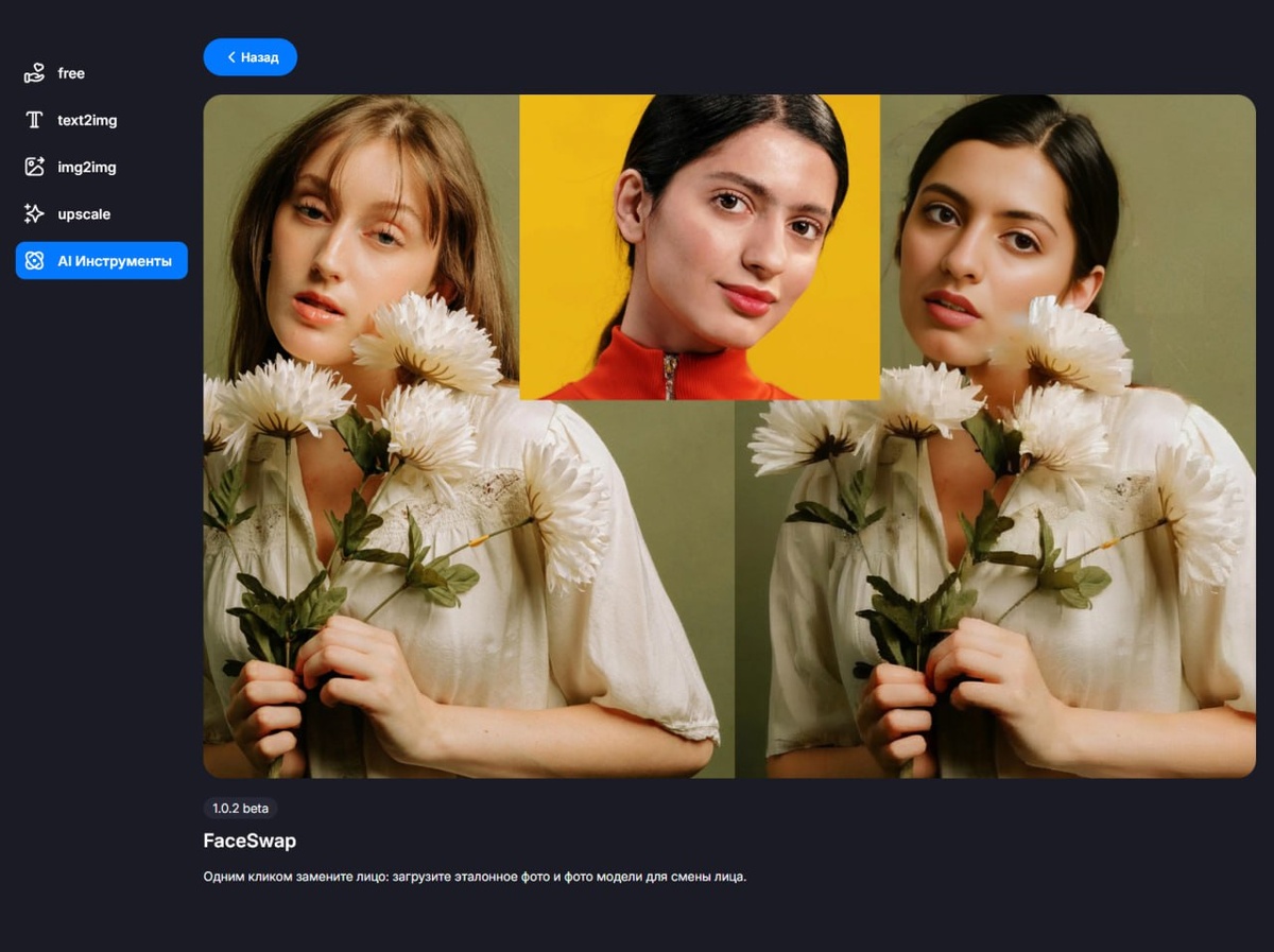 NeuroIMG: FaceSwap FaceSwap - один из AI инструментов, который мы недавно добавили в наш сервис NeuroIMG. По сути, он является DeepFake инструментом, который позволяет вам подставлять ваше лицо (или не ваше, лицо может быть любым), в любое изображение. В отличии от классических DeepFake редакторов, тут у нас происходит "перерисовка" лица с исходного на нужное, чтобы оно максимально гармонично встроилось в общую картинку. Для достижения наиболее походящих результатов, вы можете задать промпт для генерации изображения, а также настроить CFG. Инструмент FaceSwap доступен для всех пользователей на NeuroIMG.ART #neuroimg #deepfake #faceswap