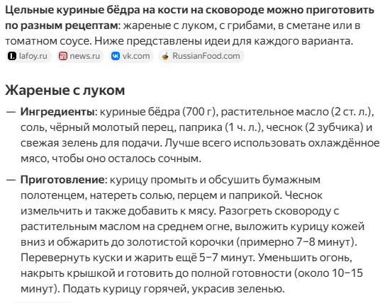 Вот и добралась я до главного) Сегодня предстоит приготовить куриные бёдра, которые мне очень лениво превращать в филе, поэтому я обратилась к вездесущему интернету во главе с Алисой, и выбираю себе рецепт для творчества 😁 Исхожу из наличия продуктов у меня на кухне. Есть варианты просто пожарить под различными маринадами, можно сделать под соусом и запечь с овощами. Всё, что запечь, автоматически идёт в категорию праздничного, ибо у меня очень неудобная духовка и морочиться с нею я согласна не часто. Поэтому ищем вариант приготовления в сковородке. Ищу самые простые рецепты, для приготовления которых досточно обычных продуктов, которые всегда есть дома, и чтоб вообще не заморачиваться сильно. Меня заинтересовали 3 варианта: Интересного тут то, что из специй предлагается только паприка и чеснок (соль и перец не считаем, это по умолчанию). Но жарить сегодня я не хочу, вчера на ужин были жареные куриные крылья.