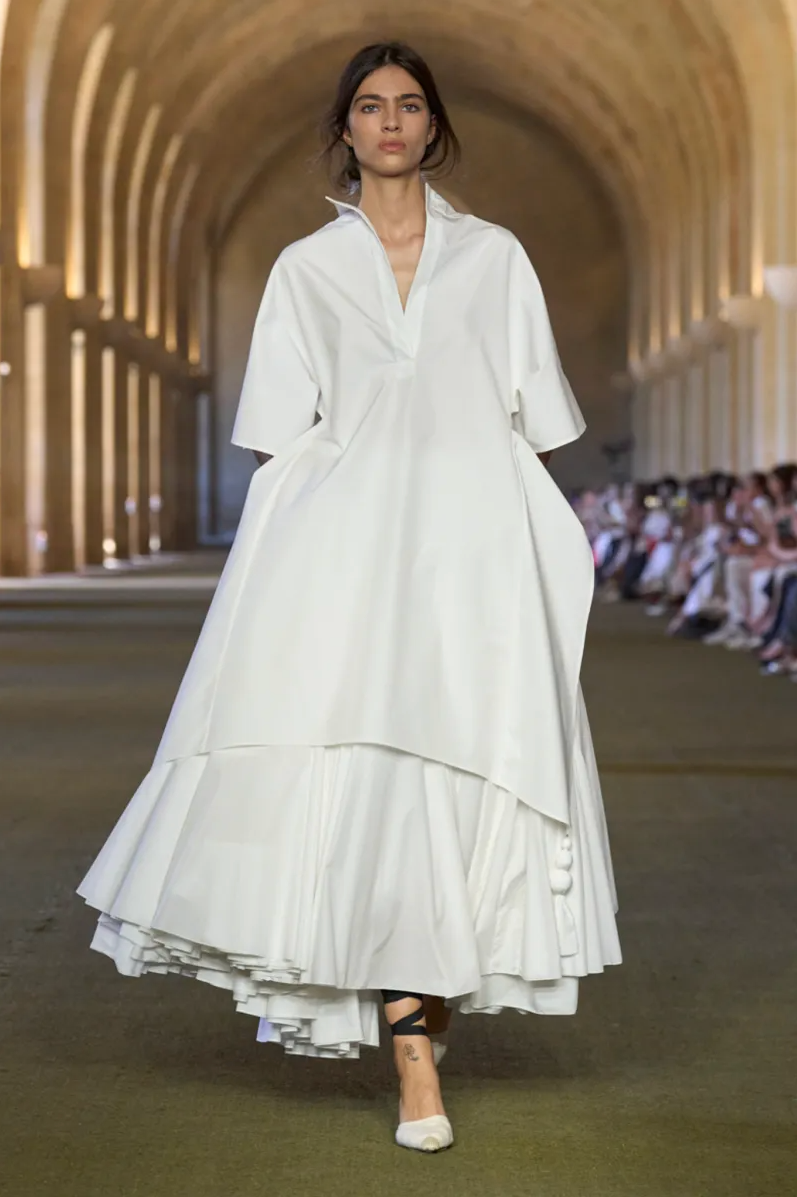 Впрочем, признаюсь: делал он это изысканно. Одежда выглядела как сон крестьянки, которая читала Vogue при свете керосиновой лампы. Поплин и лен превращались в архитектурные объемы, юбки раздувались, словно спорили с гравитацией. Были даже платья, напоминающие рождественские елки — для тех, кто хотел бы нарядиться праздником, но не сдать себя в аренду Санте.