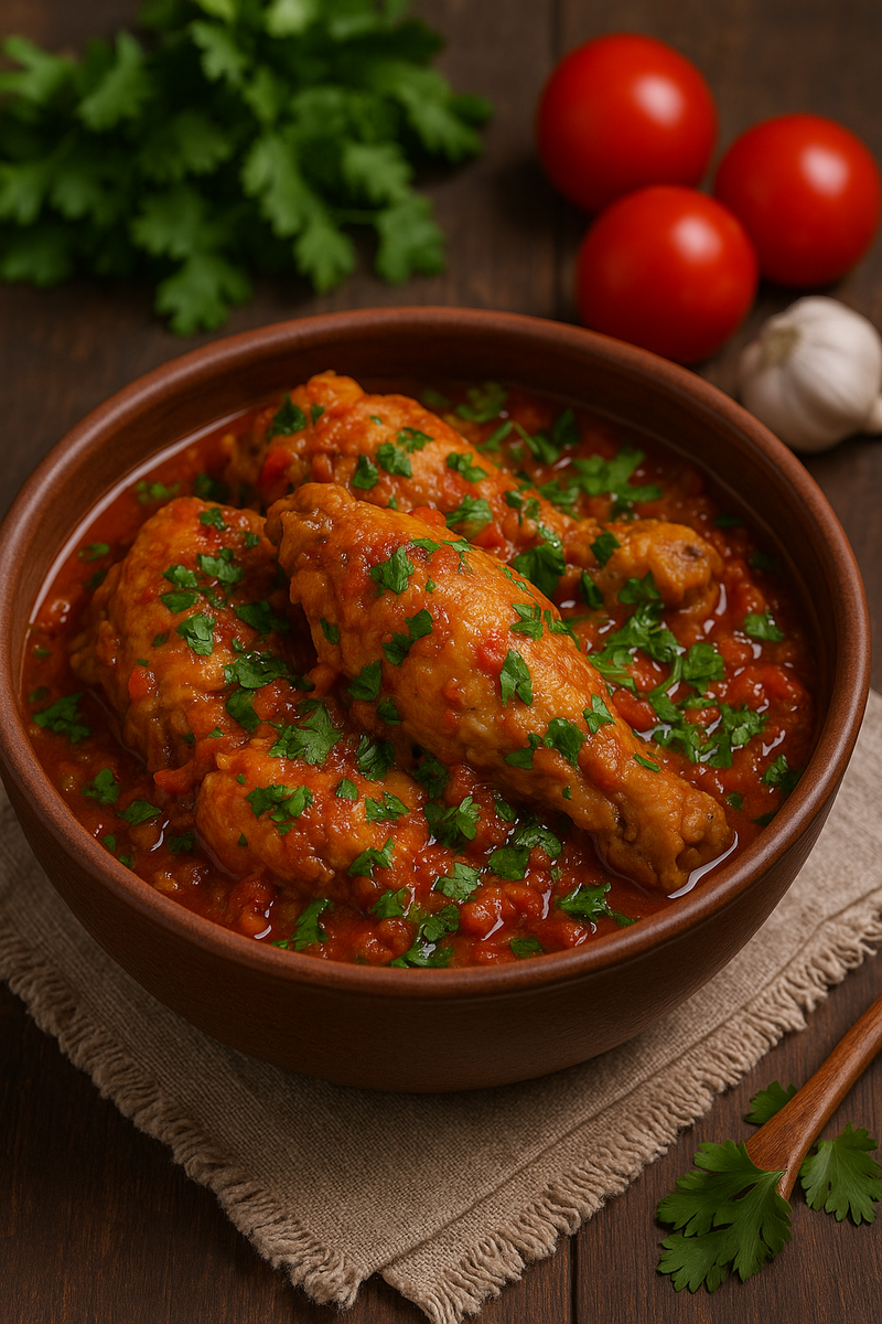 Чахохбили — это традиционное блюдо грузинской кухни, ароматное и насыщенное рагу из курицы, томатов и зелени. Исторически это блюдо готовилось из фазана, но сегодня его чаще всего делают из курицы. Вкус чахохбили — это симфония сладких томатов, пряных трав и мягкого куриного мяса, которое буквально тает во рту. В этой статье вы найдете пошаговый рецепт настоящего домашнего чахохбили, узнаете все секреты его приготовления и сможете с первого раза добиться результата, который порадует даже самых взыскательных гурманов. На 4–5 порций потребуется: Можно использовать как целую курицу, так и отдельные части: бедра, голени, крылья. Разделите курицу на небольшие куски. Кожу снимать не обязательно — она даст насыщенный вкус, особенно если вы слегка обжарите мясо вначале. Очистите лук и нарежьте его полукольцами. Не мельчите — лук в чахохбили должен чувствоваться. Помидоры нужно очистить от кожицы. Для этого сделайте на каждом небольшое крестообразное надсечение, обдайте кипятком и оставьте