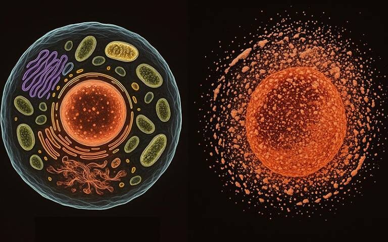 Когда это тонко отрегулированное равновесие нарушается, кальций наводняет клетку как при коротком замыкании, приводя клетки в хаос. В отличие от программируемой смерти, где происходит организованный демонтаж клеток, некроз приводит к разрыву клеток, выплёскивая токсичные молекулы в окружающие ткани.