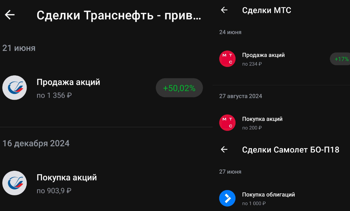 📌 Давно не писал о своих сделках, сегодня исправлюсь, а также расскажу о планах на текущую неделю. 1️⃣ Принял решение продать акции Транснефти, идея полностью отработала. Напомню, добавлял в свой портфель Транснефть по 904 рубля за акцию в декабре сразу после панических продаж на фоне повышения налога для компании до 40%. У компании по-прежнему качественный бизнес и недорогая оценка, но бОльшая часть роста уже позади. Продал по 1356 рублей за акцию (+50% за 6 месяцев), после див. отсечки, возможно, верну Транснефть в портфель. 2️⃣ Продал акции МТС по 234 рубля за акцию. Покупал в августе прошлого года по 200 рублей (+17% за 10 месяцев). Идея была в переоценке ближе к выплате дивидендов, риск выплаты менее 35 рублей посчитал маловероятным. Была возможность продать по 250 рублей в феврале, но пожадничал. Тем не менее, в переводе на годовые доходность составила 20,5% – на уровне вклада, учитывая, что в августе ключевая ставка была 18%. 3️⃣ Добавил в портфель новые облигации Самолёта БО-П