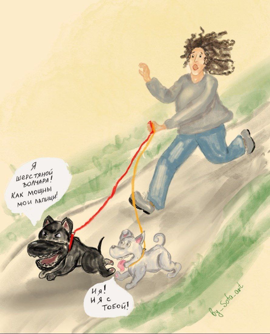 Когда я была маленькой, я встретилась с собакой Баскервилей. Собака эта жила в квартире напротив моей бабушки, к которой я заходила очень часто. Стоило мне сделать шаг в подъезд — как с четвёртого этажа раздавался леденящий кровь лай. Собака была настолько страшна, что лаяла сразу на два голоса, но абсолютно синхронно. Жуть какая, да?! А когти знаете какие были? Гигантские! Сердце уходило в пятки, когда я слышала, как это собачье отродье царапало дверь изнутри. Так и боялась каждый раз, что дверь не выдержит, и поглотит это чудовище меня вместе с потрошками и пирожками. И однажды я с ней встретилась! «Знаешь, откуда эти шрамы?»© Оказалось, что это не одна адская собака, а две маленькие собачки. Гораздо лучше умеющие произвести впечатление, чем настоящий Баскервиль! 😁 И как часто бывает: одна (та, что поменьше) была зачинщицей, а вторая просто поддерживала движуху. Воспоминание разблокировано благодаря встреченной женщине и её двум собакам-баскервилякам. Иллюстрация сделано нес