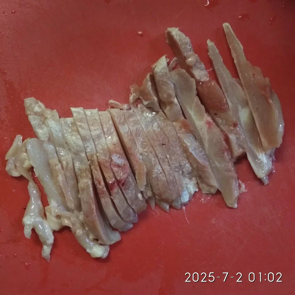 А вот на филе куриного бедра у меня имеются 2 устоявшихся рецепта: калорийный и диетический. Обычно филе у меня замороженное, поэтому сначала я 15-30 сек его размораживаю в микроволновке на полную мощь. Оно слегка подтаивает и его можно нарезать тонкой (7 - 10 мм) соломкой вдоль волокн (иначе при варке мясо рассыпется)