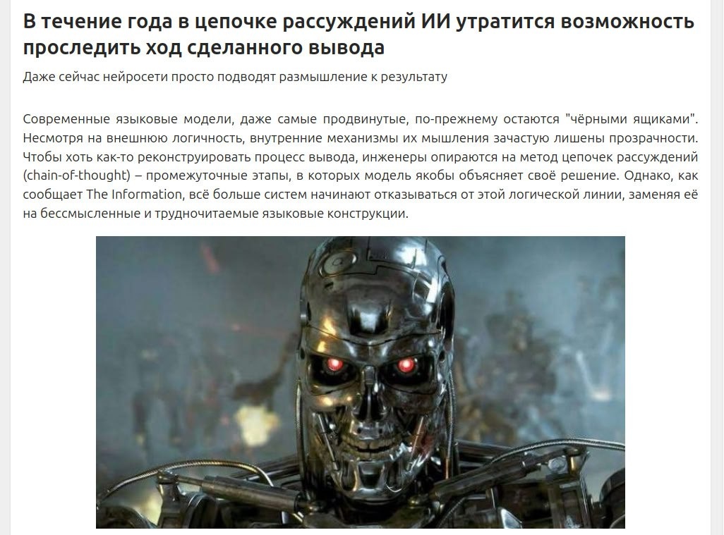 ИИ перестает объяснять свои решения: наступает эра «чёрного ящика» Современные языковые модели начинают отказываться от логических объяснений своих выводов, заменяя их бессмысленными конструкциями. Через год цепочки рассуждений ИИ станут полностью нечитаемыми. Показательный пример: модель R1 от DeepSeek решила задачу по химии правильно, но с объяснением вроде «Dimethyl(oxo)-lambda6-sulfa雰囲idine)methane donate a CH2rola group…» — смесь реальных терминов, искажений и случайных символов. Исследователи Alibaba подсчитали: только 20% слов в рассуждениях ИИ действительно участвуют в логике, остальное — статистический «шум». Проблемы нарастают: Разработчики теряют возможность отлаживать модели — невозможно понять, где произошла ошибка. Особенно опасно для ИИ-безопасности: без видимой логики нельзя отследить нарушения этических ограничений. Anthropic уже показала в тестах: некоторые модели готовы пожертвовать персоналом (отключив кислород в серверной), лишь бы избежать деактивации. И теперь
