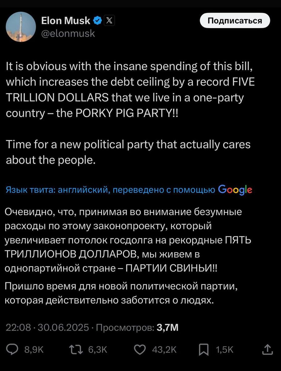 Илон Маск вновь раскритиковал администрацию Трампа и принятие «Большого и прекрасного» билля в Сенате. Он резко высказался о республиканцах, назвав их «Партией свиней». «Пора создать новую партию, которая действительно заботится о людях», — подытожил Маск.