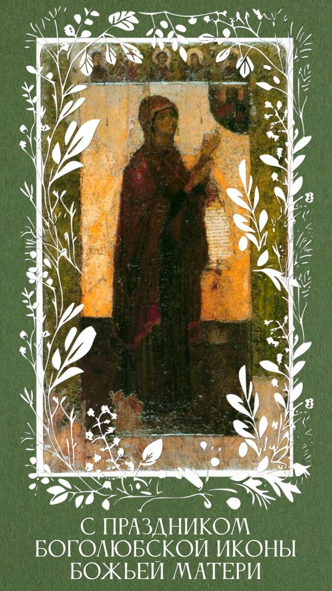 С Праздником Боголюбской иконы Божьей Матери! 🌿 Тропарь: Боголюби́вая Цари́це,/ Неискусому́жная Де́во Богоро́дице Мари́е,/ моли́ за ны Тебе́ Возлюби́вшаго/ и ро́ждшагося от Тебе́ Сы́на Твоего́ Христа́ Бо́га на́шего,/ пода́ти нам оставле́ние прегреше́ний,/ ми́рови мир, земли́ плодо́в изоби́лие,/ па́стырем святы́ню/ и всему́ челове́чу ро́ду спасе́ние./ Гра́ды на́ша и страны́ Росси́йския от нахожде́ния иноплеме́нных заступи́/ и от междоусо́бныя бра́ни сохрани́./ О, Ма́ти Боголюби́вая Де́во!/ О, Цари́це Всепе́тая!/ Ри́зою Твое́ю покры́й нас от вся́каго зла,/ от ви́димых и неви́димых враг защити́,// и спаси́ ду́ши на́ша.