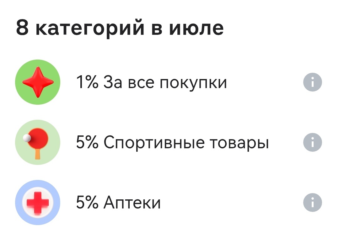 Я являюсь клиентом семи банков, и, конечно, пользуюсь их программами лояльности. Чтобы не запутаться, пишу здесь. В прошлом месяце статью не написала, в результате оказалось, что в одном банке кэшбэк я не получила, потому что не выбрала категории. Бывает! В июле банки оказались не очень щедры, но я постаралась выбрать лучшее для себя. В Альфе выбирать было особо нечего, и вряд ли я этой картой воспользуюсь. Зато покрутила барабан, и мне выпало такое счастье. Жаль только, что до 7 июля я никуда ехать не собираюсь. Тут для меня основная категория - это Супермаркеты. Не знаю, воспользуюсь ли Детскими товарами - у нас в городе даже магазинов с этим МСС нет. Остальное выбрала на случай поездки на отдых. Здесь для меня реально воспользоваться категорией Дом и ремонт. Все остальное тоже на случай поездки. Здесь у нас кэшбэк 1,5% на все, рассчитывается до копейки. Покупаю на эти карты то, что не попадает под повышенный кэшбэк у других банков. В Сбербанке в этот раз неплохие категории. Буду рас