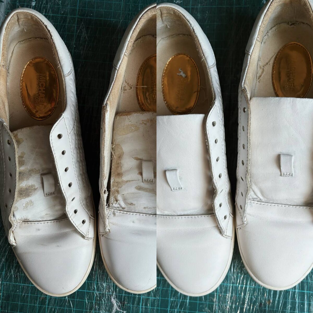 В работе были вот такие кроссовочки Michael Корс, язычки все потрескались и покрытие слезло частями. Кожа не натуральная на данных элементах.