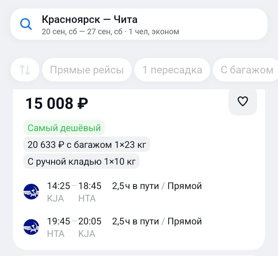 Ну вот и июль. Можно спокойно постить билеты на осень. Востребованная (неожиданно) Чита. По хорошим тарифам в сентябре-октябре. https://aviasales.tpm.lv/Fe1wXftZ 15000₽ ↔️ без багажа #HTA @KJA