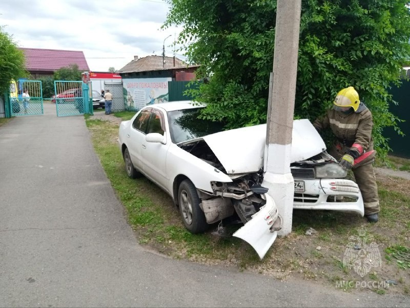 В Минусинске водитель иномарки потерял сознание и врезался в столб На ликвидацию последствий аварии выезжали представители пожарно-спасательного подразделения. Спасатели отключили аккумулятор, чтобы избежать пожара. Фото: МЧС России