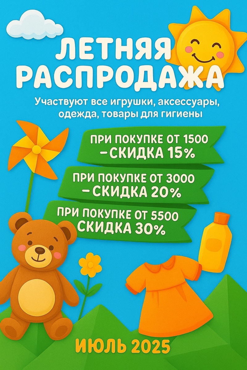 🌞 ЛЕТО, КОГДА ВСЁ МОЖНО! И даже — купить любимые игрушки со скидкой до 30%! 😍 🐻 Летняя распродажа в нашем детском магазине уже началась! 🎁 Участвуют все товары: игрушки, одежда, гигиена, аксессуары! 💥 При покупке от 1500 ₽ — скидка 15% 💥 От 3000 ₽ — скидка 20% 💥 От 5500 ₽ — скидка 30% 📆 Только в ИЮЛЕ 2025 💬 А вы уже выбрали своего медвежонка? 👇 Пиши в комментариях, кто у вас главный шопоголик в семье 😄 ⠀ #летняяраспродажа #детскиетовары #скидкидлямам #игрушкиоптом #мамапермь #пермьмама #подаркидлядетей #акцияиюль #игрушечнаярадость #скидкидетям