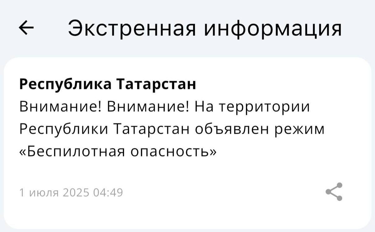 ❗️◽️◽️◽️В Татарстане с 04:49 действует режим «Беспилотная опасность