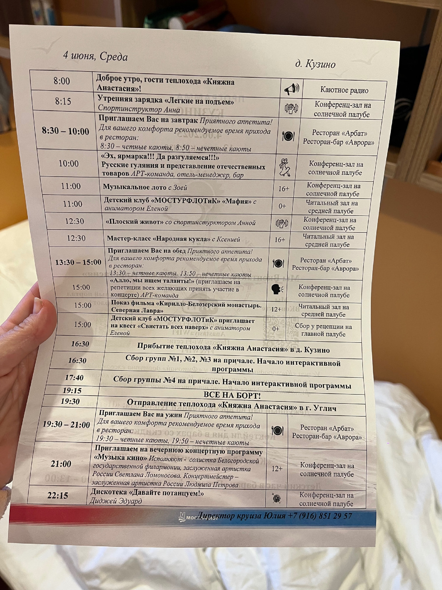 Вот такое расписание активности сегодня на теплоходе «Княжна Анастасия».
