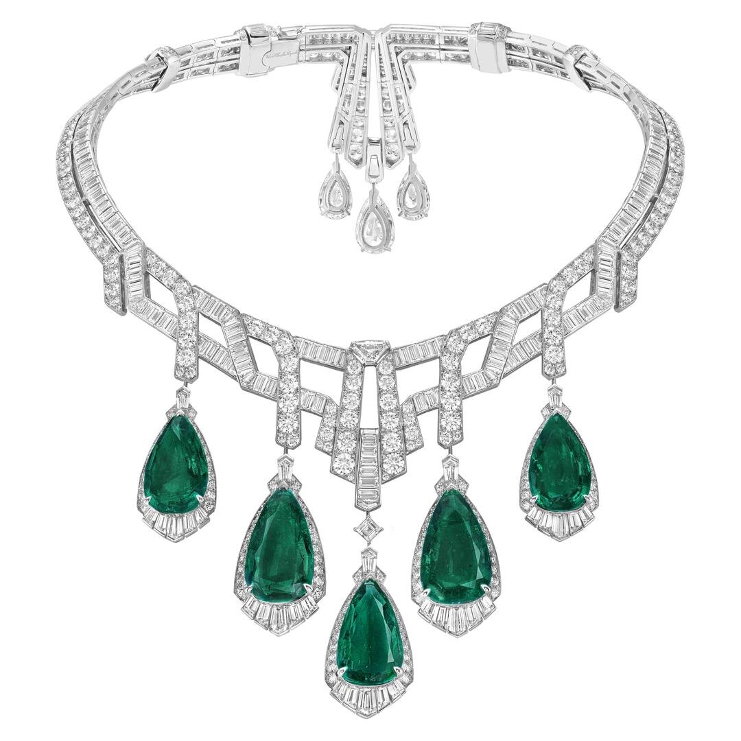 В то время как оригинальный воротник имеет девять изумрудных капель, новичок имеет пять колумбийских изумрудов грушевидной формы, которые в сумме составляют 70,40 карата. Изумруды были разрезаны на две части из старых, более толстых подвесок, которые находились в хранилище драгоценностей дома. Хотя Van Cleef не уточняет, где были добыты камни или их возраст, глубокий зеленый цвет и богатство внутренних садов в каждом камне указывают на материал, найденный в старых шахтах Колумбии. В стиле ар-деко изумруды окружены лентами из бриллиантов багетной и треугольной огранки, а застежка представляет собой изысканную деталь с дорожкой бриллиантов по затылку.