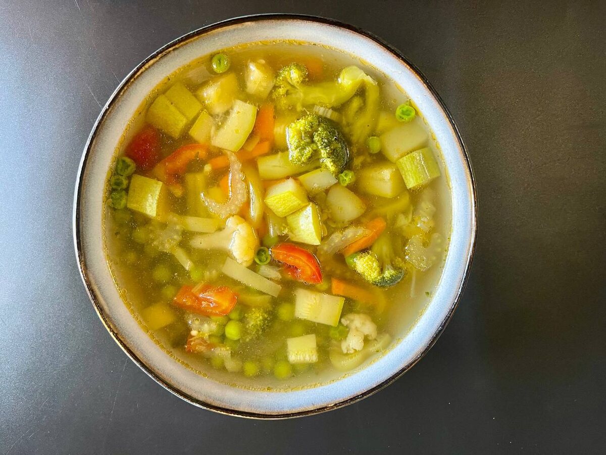 🔠🔠🔠🔠🔠🔠🔠🔠🔠🔠. Настоящий летний Овощной суп. Продолжаем зачистку морозильной камеры и отсека для овощей. 😁 Ингредиенты (4 л кастрюля) 1️⃣ Капуста цветная - 400 гр (1 упаковка свежемороженной) 2️⃣ Капуста брокколи - 400 гр (1 упаковка) 3️⃣ Горошек свежемороженый, зелёный - 400 гр 4️⃣ Сельдерей черешковый - 2 черенка 5️⃣ Кабачок - 2 шт.небольших 6️⃣ Морковь - 1 шт 7️⃣ Помидорка - 1 шт 8️⃣ Перец болгарский (ласточка) - 3 шт 9️⃣ Соль - по вкусу. 🔟 Вода - 2,5 л Приготовление: 1. Ставим кастрюлю 5 л., с водой, на огонь. 2. Отправляем порезанную тонкими брусочками морковку и сельдерей. 3. Режем брусочками перец, пока закипает вода 4. Вода закипела - добавляем перец. 5. Кипит? Скорее в кастрюлю кубики кабачка (с кожурой) 6. После закипания - кружочки помидора. Там ему самое место! 7. Вода снова закипела - отправляем размороженные капусты и горошек. 8. Доводим до кипения, солим. Варим 10 минут. Я положил чайную ложечку панч пурена (https://dzen.ru/media/id/63fedc01babcd1299d839d49/s
