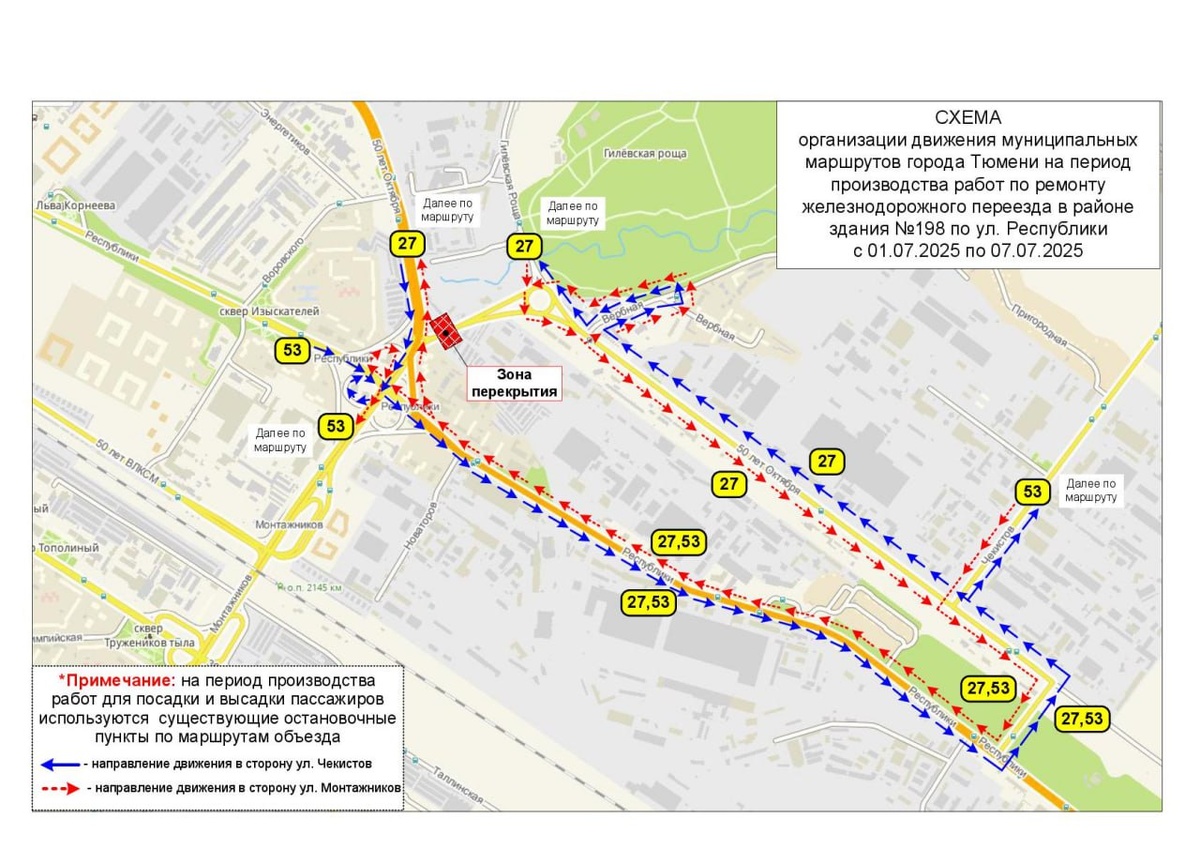 Маршруты №№ 27, 53 временно изменят схему движения В период с 1 по 7 июля 2025 года в связи с выполнением работ по ремонту железнодорожного переезда в районе здания по ул. 50 лет Октября, 198 (съезд с кольца у Гилевской рощи в сторону ул. Республики) маршруты №№ 27, 53 будут следовать в объезд перекрытого участка со всеми существующими остановочными пунктами по маршрутам объезда. Расписание для пассажиров общественного транспорта доступно в разделе «Расписание» на сайте tgt72.ru, в мобильном приложении «Тюменский транспорт», по бесплатному номеру телефона информационно-справочной службы 8-800-250-0722 и на остановках. МКУ «Тюменьгортранс»