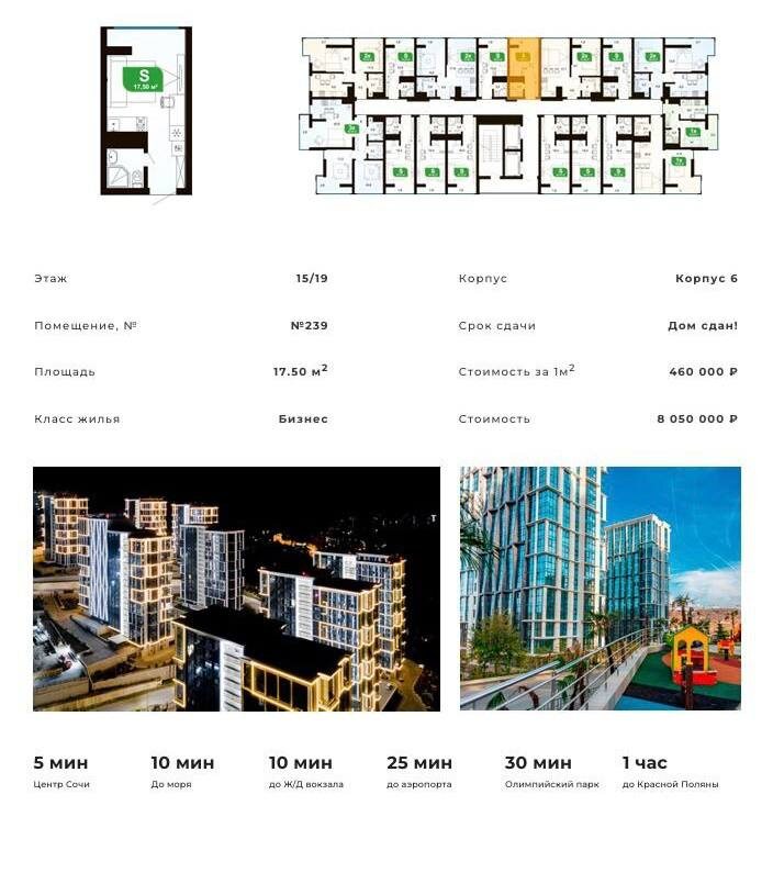 ‼️В продаже появились две студии "малышки" в Жилом комплексе бизнес-класса Сочи🌴‼️ - 6 корпус - этажи 15 и 17 - стандартное окно - будет видно море 🌊 Стоимость в оффере прайсовая, но есть возможность согласовать с переводом по 330 000 м2 5 775 000 вместо 8 300 000 🔥 УСПЕВАЙТЕ ‼️ ☎️8 951 324 66 58