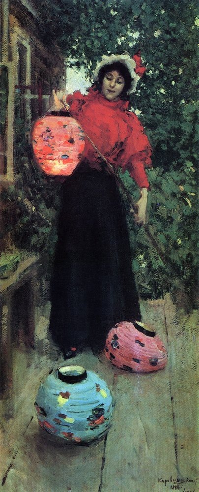 — Красная блуза на фоне холодной зелёной листвы и ритмичные повторяющиеся тёмные пятна: юбка, волосы, роспись фонарей