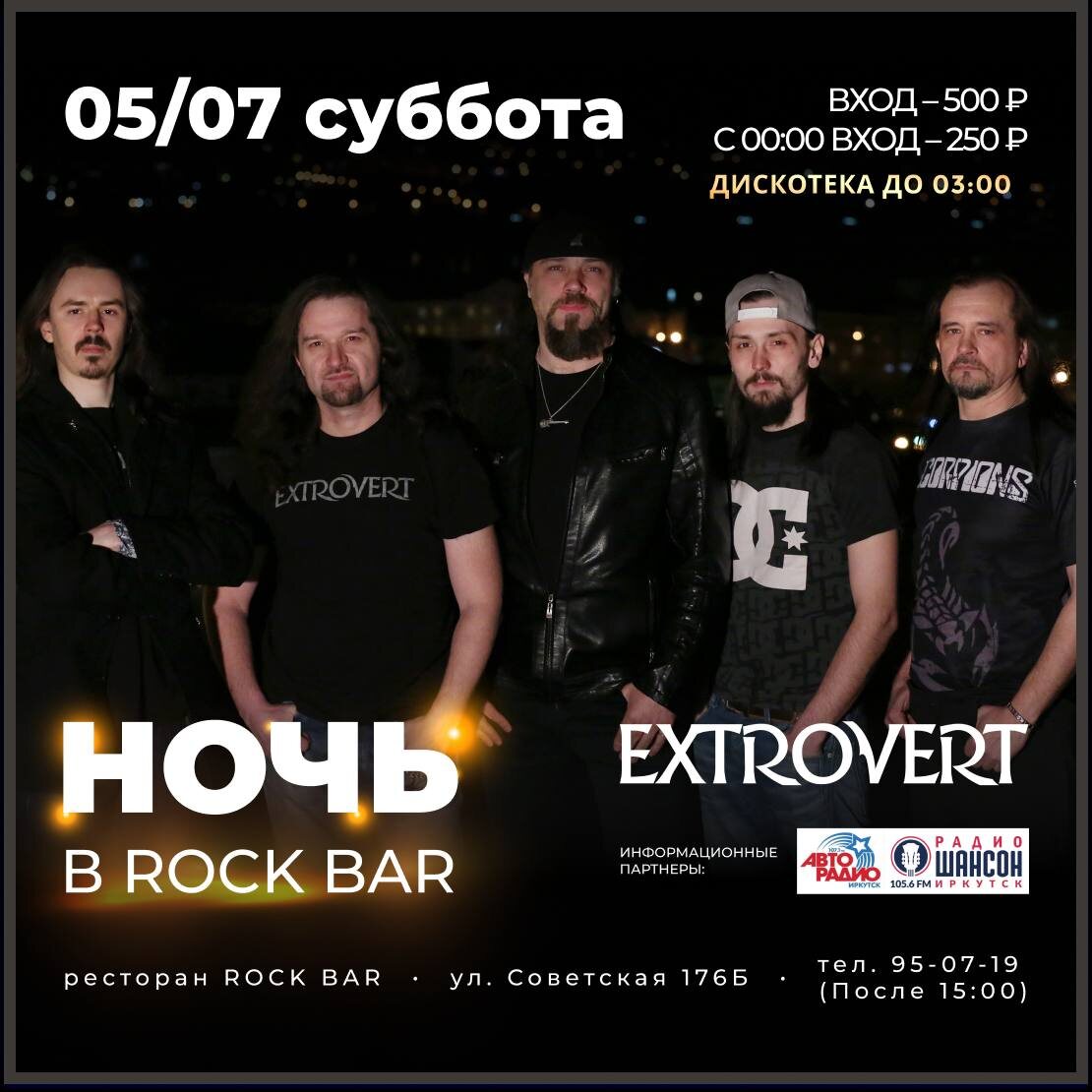 5 ИЮЛЯ СБ. ”НОЧЬ В ROCK BAR” 21:30-03:00 ГРУППА EXTROVERT & ДИСКОТЕКА В эту субботу снова будет драйвово и мощно - на сцене рок-группа EXTROVERT, а в продолжении концерта - дискотека из хитов всех стилей и времен. Вход 500₽, с 00:00 - 250₽ АС 18+ FC/DC Данная публикация носит исключительно информационный характер. 📞INFO/RV (с 15:00) +7-9148-95-07-19 💻 INFO/RV: www.rockbar38.ru 📍г.Иркутск, ул. Советская 176Б