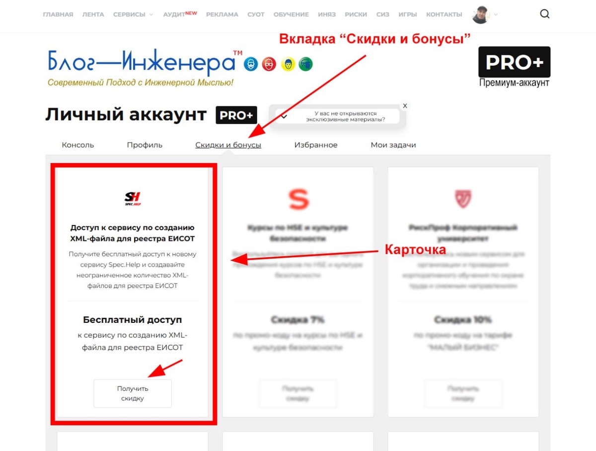 ⚠️ Внимание! Обновили промокод в SPEC.ЕИСОТ ℹ️ С 1 июля 2025 года для доступа к нашему сервису SPEC.ЕИСОТ требуется новый промокод! Новый промокод доступен для копирования в личных аккаунтах пользователей PRO+ на Блог—Инженера. Если авторизованы в Личном аккаунте на Блог—Инженера, то можно сразу попасть в карточку с промокодом по этой ссылке. Путь к промокоду: Личный аккаунт > Вкладка "Скидки и бонусы" > Первая карточка "Доступ к сервису по созданию XML-файла для реестра ЕИСОТ" > Скопируйте новый промокод > SPEC.ЕИСОТ ❗️SPEC.ЕИСОТ — Сервис Блог—Инженера, где можно создавать неограниченное количество XML-файлов для их последующей загрузки в ЕИСОТ Минтруда. Важно! Мы не храним, не обрабатываем и не используем данные, которые загружаются пользователями для конвертации в XML. После конвертации у нас ничего не остаётся. Блог—Инженера для тебя ❤️