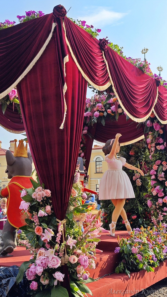 Верите ли вы, что цветы умеют танцевать? В Петербурге - запросто! Особенно под музыку Чайковского! Если бы вы видели, во что превратили флористы платформу «Щелкунчик» на Соборной площади! Я стоял, будто заворожённый: передо мной разворачивался самый настоящий театр. Бордовые бархатные «шторы», будто только что раздвинутые перед началом балета. А за ними — целое волшебное царство: вот Щелкунчик в парадном мундире в окружении алых роз, Мышиный король и танцовщица. А аромат! Воздух гудел от сладкого дыхания пионов пудрово-розовых, как балетные пачки, и бархатных бордовых роз, похожих на театральные кулисы. Казалось, ещё миг — и лепестки сорвутся в танце под знакомый мотив «Вальса цветов»! Ведь вся эта красота — ода 185-летию Петра Ильича Чайковского. Флористы не просто воссоздали сцену, они оживили музыку. В алых всплесках маков слышался грохот битвы с мышами, в переливах нежно-розовых лилий — лирическая тема Мари... А вам, дорогие друзья, какая мелодия Чайковского первая приходит Пока