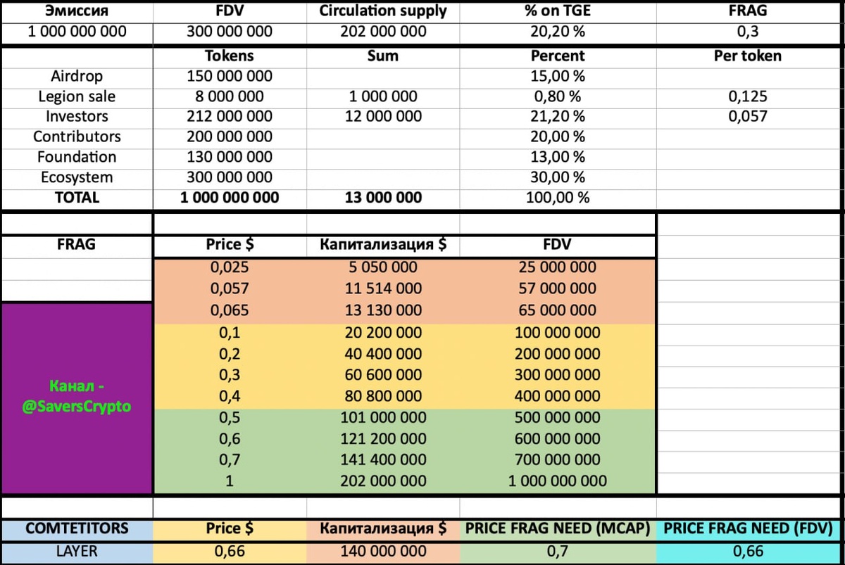 #FRAGMETRIC #FRAG #РАЗБОР КАКУЮ ОЦЕНКУ ЖДАТЬ НА ВЫХОДЕ❓ ✅Сегодня в 10:30 мск стартует клейм токенов FRAG - здесь Торги будут на биржах в 11:30 мск, но до этого явно можно будет и на дексах слить токен. Давайте быстренько об оценке и ожиданиях 📌СРАВНЕНИЕ С КОНКУРЕНТАМИ: Самое уместное и по сути единственно верное сравнение это с Solayer и их токеном Layer Да, еще пару месяцев назад токен стоит сильно дороже, но имеет смысл сравнивать с текущей оценкой Если это сделать, то увидим, что цена FRAG должна быть при той же оценке в районе 0.6$-0.7$, но так как Solayer первопроходец рестейкинга на базе Соланы, а все остальное идет вторично и без новаторства, то я бы делил ожидания ровно на 2 (ну может даже в 2.5-3) ✍️Тем самым, на мой взгляд логично ориентироваться на цену в районе 0.3$ с MCAP 60 млн и FDV 300 млн Естественно, не доллар в доллар и скорее всего мы увидим определенный диапазон проторговки типа 0.2$-0.4$, ну а в какую сторону из этого диапазона выйдем мы узнаем уже на ли