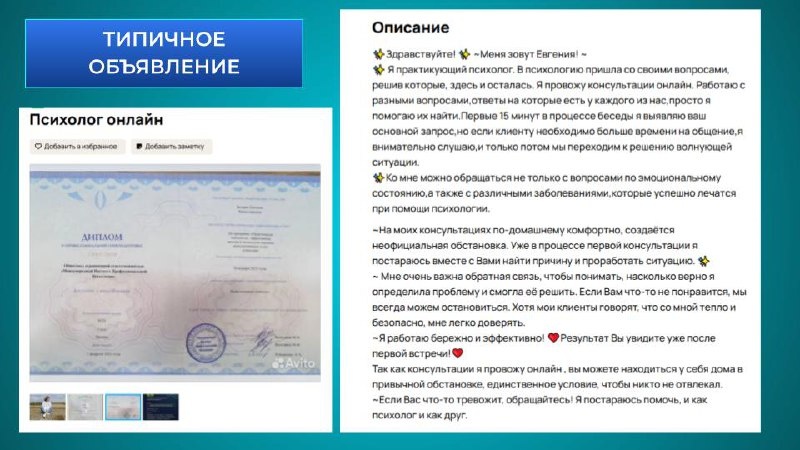 Ты пробовала— но не сработало. Почему? Ты не одна. 🔹 Кто-то уже выкладывал объявление на Авито, но получил тишину. 🔹 Кто-то смотрел чужие — и думал: «ну понятно, здесь точно ничего не продать». 🔹 Кто-то, возможно, узнал себя на этой картинке ☝️ 📸 Вот такое типичное объявление я вижу на Авито каждый день Доброе, искреннее, но не работает. Почему? Вот три причины, по которым такие объявления просто пролистывают: 1️⃣ Заголовок ни о чём «Психолог онлайн» Листают дальше, не вчитываясь. 👉 На Авито у тебя 1 секунда — ты либо зацепил, либо ушёл в небытие. 2️⃣ Фото — диплом Это сразу вызывает ощущение «сдача зачёта», а не решение боли. 👉 Покажи лицо, тёплую атмосферу, доверие. 3️⃣ Текст — добрый, но слишком общий «Я работаю с разными вопросами, помогаю найти ответы» Какими вопросами? Каким людям? Какой результат? И это не вина автора. Это то, как нас учили оформлять себя в соцсетях или на сайтах. Но Авито — это другая логика. Там ищут не экспертность, а простое и понятное решение.