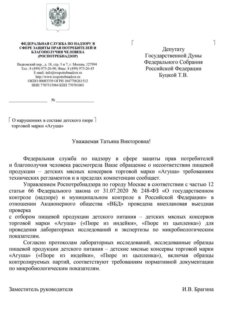 ❗️Роспотребнадзор не выявил нарушений в товарах детского питания и смесях В СМИ и соцсетях появлялись новости о нарушениях в составе, несоответствии техническим регламентам и иным проблемам в продукции детских товаров — смесях или иных продуктах питания. Конкретно речь идет об Агуше, Инфаприме, Нутрилаке и Нестле. 📨 По каждому случаю я писала отдельное обращение на имя главы Роспотребнадзора Анны Поповой с просьбой провести проверку качества и соответствия всем регламентам вышеуказанной продукции. 📩 И вот мне пришли ответы по поводу товаров Агуши, Инфаприма и Нутрилака. Ведомство сообщило, что проводило контрольную закупку некоторых товаров и осуществляло проверку в лабораториях. Никаких нарушений не выявлено у Агуши и Нутриции. У Нутрилака есть нарушение в части товарно-сопроводительных документов на сырье. По результатам проверки Нестле пока жду ответ. #Депутат_Буцкая