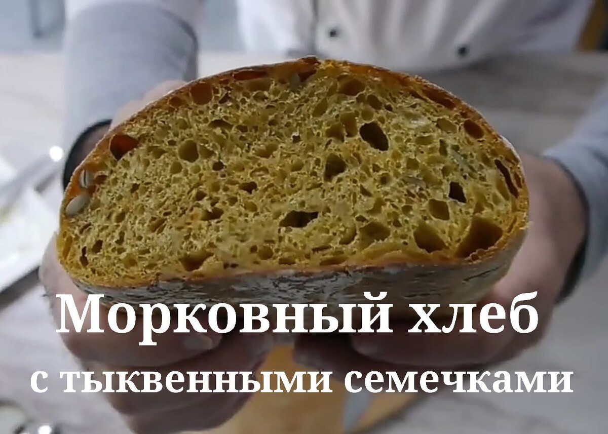 Рецепт: Опара: 3-5 гр пшеничной или ржаной закваски 100 гр воды 100 гр пшеничной муки в/с Тесто: Вся опара 425 гр пшеничной муки в/с 175 гр пшеничной цельнозерновой муки 150 гр очищенной сырой моркови 290 гр воды 100 гр тыквенных семян 20 гр сахара или мёда 20 гр сливочного масла 14 гр соли К 3-5 гр пшеничного или ржаного стартера добавьте 100 гр воды и столько же пшеничной муки высшего сорта, помещайте, накройте крышкой и оставьте при комнатной температуре на 10-12 часов на брожение. Заранее обжарьте тыквенные семечки чтобы они стали хрустящими и остудите. Уже перед созреванием опары почистите морковь, нарежьте кольцами и пробейте блендером со 100 гр воды которые возьмите из рецепта. После созревания опары добавьте к ней воды (190 гр), всю муку и морковное пюре, хорошо смешайте и оставьте на аутолиз на 20-30 минут. По истечении времени начинайте замес (руками или в тестомесе) сначала добавляем соль, потом сахар, далее сливочное масло и в самом конце тыквенные семечки. Об