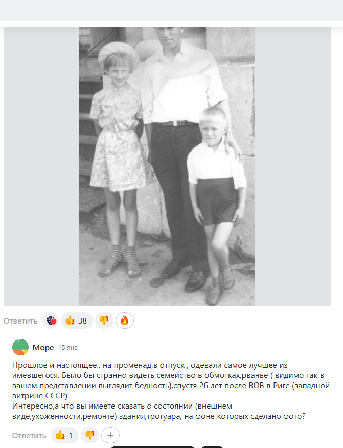 После его реставрации я снимок выложил и сразу последовал странный комментарий (смотрите на скриншоте). Комментатор без тени сомнения тут же выдал нагора "умную фразу", надели, мол, самое лучшее ради отпуска. С чего взял? Решил, что другой приличной одежды в семье не было? Народ рабочий советский в обмотках ходил и только по праздникам мог во что- то красивое нарядиться? Затем, написал ещё немного бреда про "26 лет" и попросил оценить фон, ибо с чего- то да почему- то ему состояние фасада и тротуара не понравились. Личный опыт тех времён. Никогда не одевали "всё самое лучшее" ради таких поездок, а в Ригу с Юрмалой мотались поездом. Всего- то 150 км. "дизелем" и билеты стоили копейки. Не напрягали нас такие поездки.