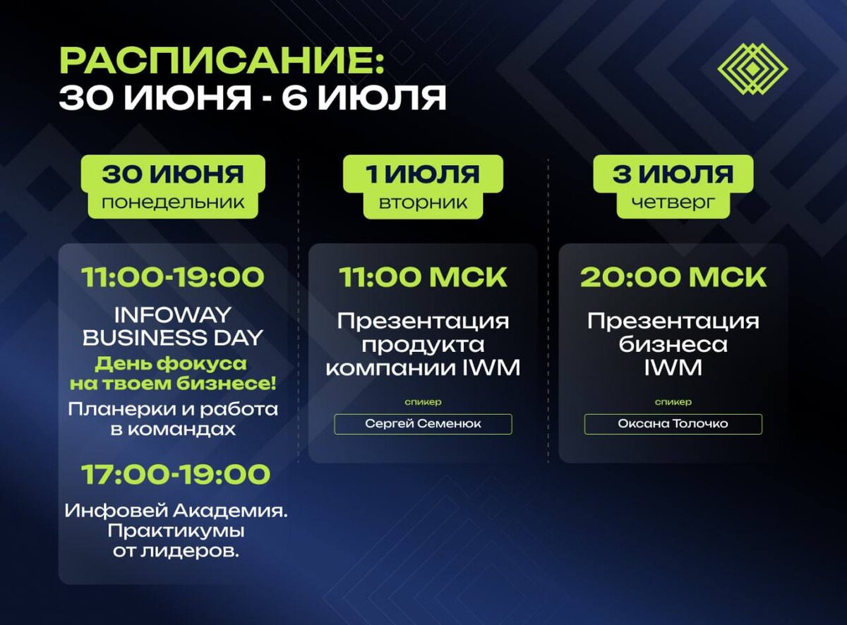 ➕➕➕➕➕➕➕➕➕➕ Сегодня понедельник, 30 июня – отличное время, чтобы задать темп всей рабочей неделе! Мы приготовили для вас насыщенную программу, которая поможет вам оставаться в курсе последних тенденций и прокачать свои навыки, получить заряд мотивации и новые инструменты для роста вашего бизнеса. Вас ждет: 🟢Сегодня, 30 июня (понедельник): 11:00 - 19:00 (МСК): INFOWAY BUSINESS DAY. День фокуса на твоем бизнесе! Планерки и работа в командах - ключ к синергии и достижению невероятных результатов. 🟢17:00 - 19:00 (МСК): Инфовей Академия. Практикумы от лидеров. Получите ценные знания и практический опыт от лучших! 🟢1 июля (вторник): 11:00 (МСК): Презентация продукта компании IWM. Спикер – Сергей Семенюк. 🟢3 июля (четверг): 20:00 (МСК): Презентация бизнеса IWM. Спикер – Оксана Толочко. Присоединяйтесь к нам, участвуйте, задавайте вопросы, будьте активными! Желаем всем продуктивной и вдохновляющей рабочей недели!