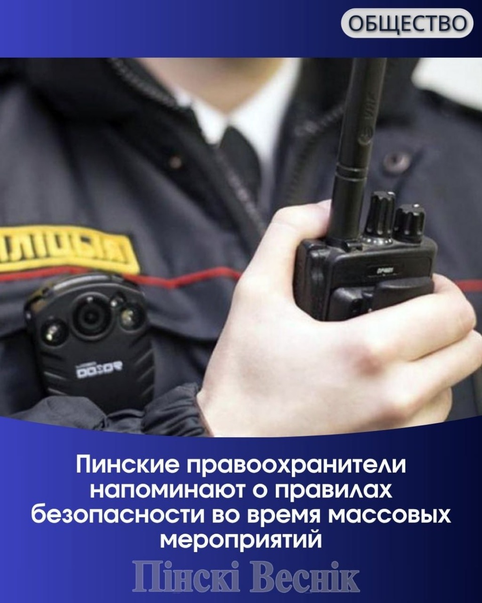 ✔️На праздничных мероприятиях охрана общественного порядка будет обеспечиваться сотрудниками органов внутренних дел. 👉Важно помнить о запретах: не рекомендуется брать с собой оружие, алкогольные напитки в стеклянной таре, напитки в темных пластиковых бутылках, а также пиротехнические изделия. 👉Граждане могут обращаться за помощью к милиции, находящейся на месте, или позвонить по номеру 102 в любое время. Будьте внимательны и соблюдайте правила для безопасного и приятного времяпрепровождения! 📍📍@Пинский Вестник ЮТУБ | САЙТ| ИНСТ | ВК | ОК | ФЕ | Прислать новость