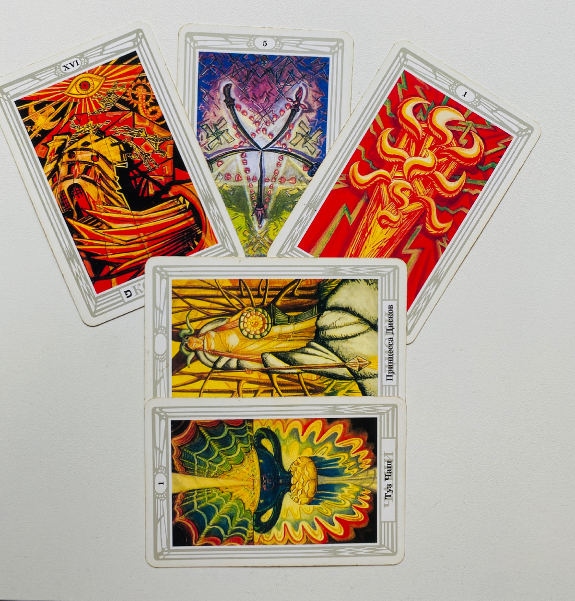 И вот по Пятерке Мечей видно, что, несмотря на всю свою силу, эта тяга вызывает в нем внутренний конфликт, борьбу, возможно, даже ощущение некой "проигранной битвы" с самим собой.
