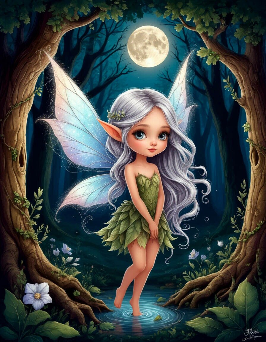 В дремучем лесу, где могучие дубы шептали древние тайны, а серебряные ручьи журчали мелодичные песни, жила фея по имени Луна. Её крылья, переливающиеся всеми оттенками ночного неба, были невесомыми, как паутинка, а длинные, серебристые волосы струились подобно лунным лучам.