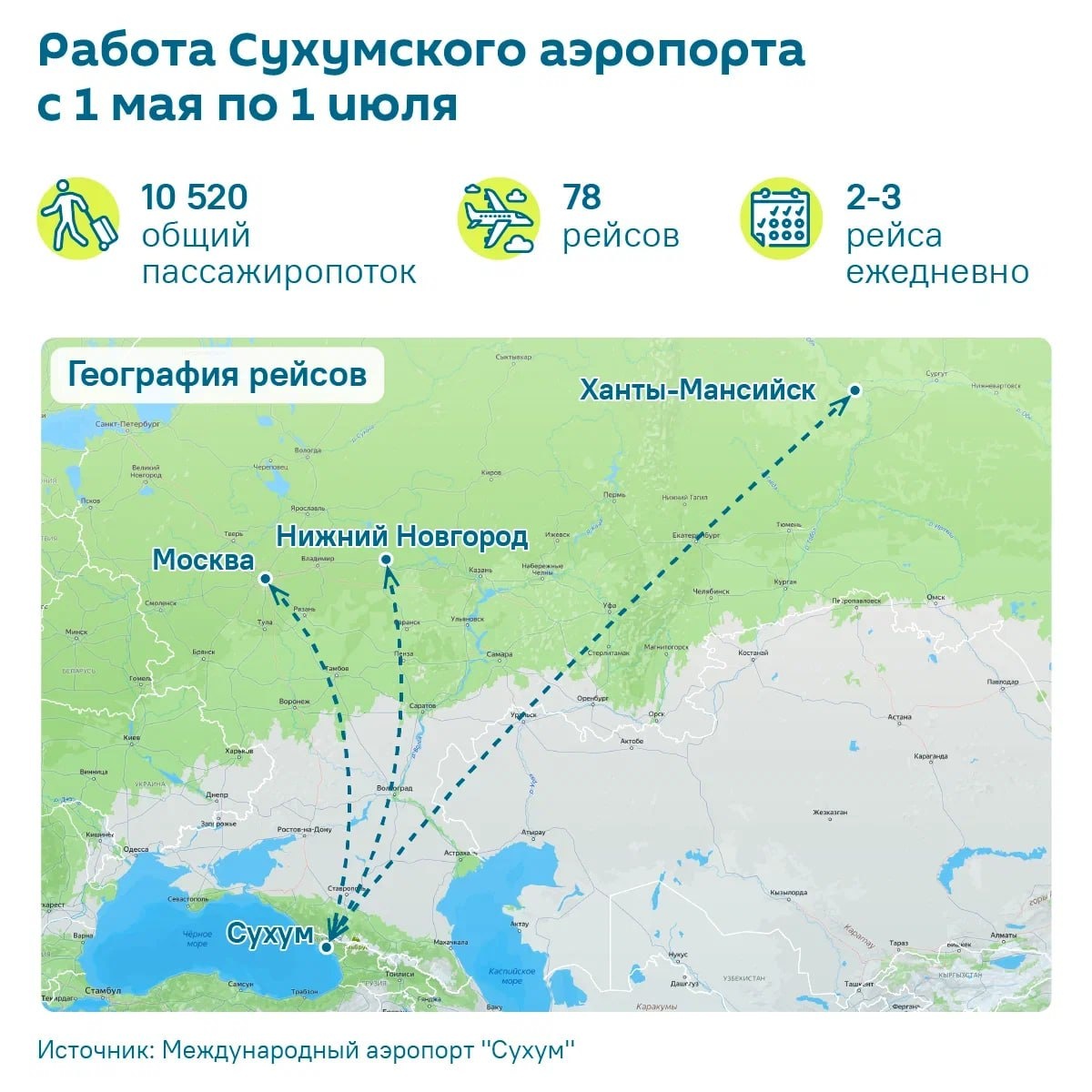 10 520 человек составил пассажиропоток Международного аэропорта «Сухум» им. В. Ардзинба с 1 мая по 1 июля, сообщает Sputnik Абхазия.