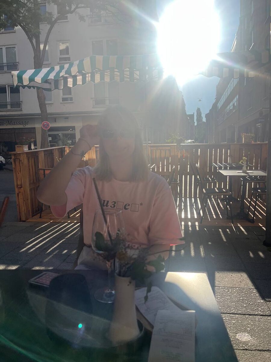 В Мюнхене +30 уже несколько дней. И еще дня 4 будет так. Без кондиционеров прям сложно! (Немцы считают, что кондиционеры — сильно дорого, шумно и прочее, и даже в нынешнем офисе у меня нет системы кондиционирования…). Но с вентиляторами и водой со льдом как-то справляемся! А за футболку спасибо подругам, благодаря которым она теперь у меня 🩷